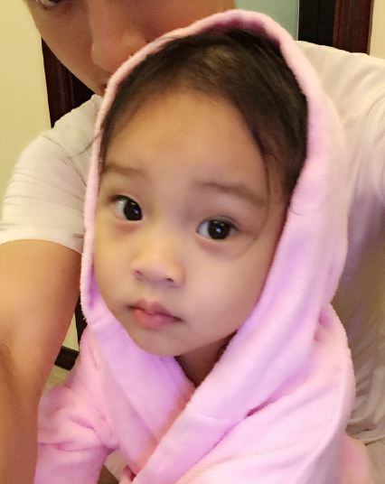 照片中,馨馨身穿白色半袖,一层碎发贴在额头上,吐出舌头对着镜头卖萌;也有她微斜嘴角,表情冷傲的模样;以及馨馨身穿粉色戴耳朵的睡衣,在爸爸怀里大笑的画面,十分可爱。
