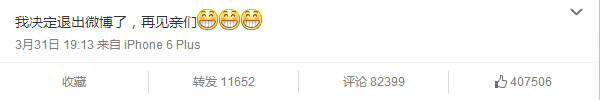邓超扬言要退出微博 网友:提前过愚人节不可信 2015-07-03 07:56 成都商报 作者:作者: 我要评论0 中新网讯 一向喜欢在微博上搞怪的邓超留言称“我决定退出微博了,再见亲们”。对此,网友纷纷表示明日是愚人节,不会相信邓超的话。 面对邓超搞怪留言,网友调侃道,“小心娘娘把你揪回来”、“你是把今天当愚人节了么”、“我才不信,呵呵”。 微笑 流汗 难过 羡慕 愤怒 流泪 复制网址 打印 收藏 0