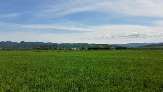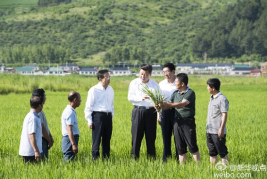 16日下午,习近平来到位于海兰江畔的和龙市东城镇光东村。进村前,经过一大片水稻田。这里是有“平岗绿洲”之称的延边地区最大的水稻基地。7200公顷绿油油的秧苗长势喜人。