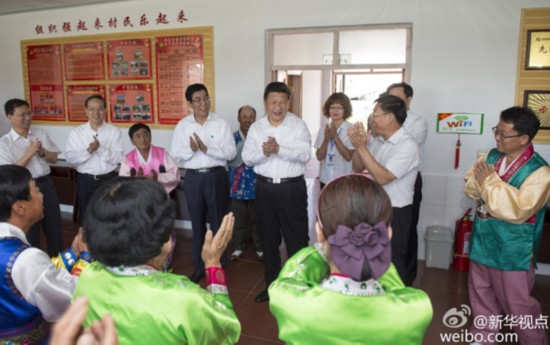按照朝鲜族习俗,习近平脱鞋走进屋里,察看主人的生活起居情况。随后,盘腿而坐同乡亲们拉起家常。习近平说,这是他第一次到朝鲜族聚居区考察调研。当得知一些村民还在使用传统的旱厕,习近平指出,随着农业现代化步伐加快,新农村建设也要不断推进,要来个“厕所革命”,让农村群众用上卫生的厕所。基本公共服务要更多向农村倾斜,向老少边穷地区倾斜。习近平指出,我们正在为全面建成小康社会而努力,全面小康一个也不能少,哪个少数民族也不能少,大家要过上全面小康的生活。