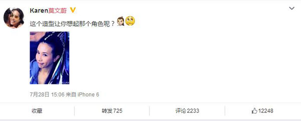 中娱网讯 www.yule.com.cn 28日,莫文蔚通过微博上传了一张古装造型的自拍照,照片中,莫文蔚梳着高耸的发型,蓝紫色相间的发色让她看起来十分漂亮妩媚。她还在微博写道:“这个造型让你想起哪个角色呢?”。网友们纷纷猜测这是她在《大话西游3》的角色造型。纷纷留言表示:“白晶晶,我心中的白晶晶啊”、“我们的晶晶姑娘!!”、“又见晶晶姑娘了啊”、“大话西游之月光宝盒》中的晶晶姑娘,20年后~~终于回来咯!!!”等等。