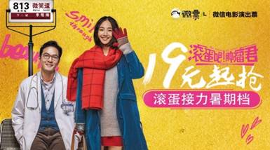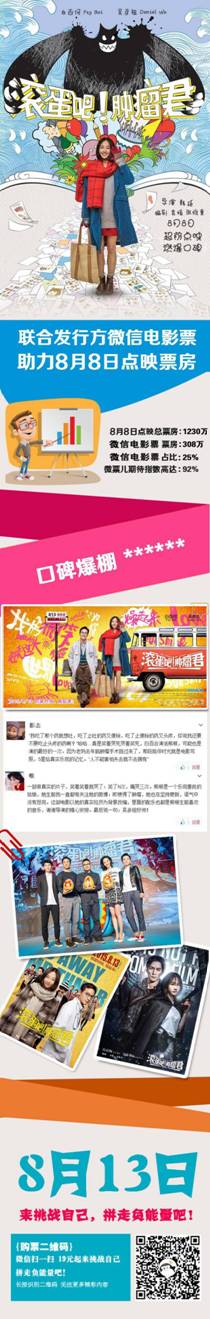 而在此次电影的宣传中,微信电影票作为《滚蛋吧!肿瘤君》发行方与首家票务开售平台,充分发挥了具有社交属性的移动互联网平台发行能力,整合大量资源支持影片宣传,并为本次的电影活动制作了一轮H5专题页面,助力口碑发酵。《滚蛋吧!肿瘤君》点映票房1230万,其中微信电影票占比达到25%,贡献约308万票房。