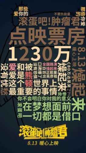 《滚蛋吧!肿瘤君!》改编自熊顿的同名畅销漫画,力求打造成为今年华语电影的口碑之作。剧情中有清新、有唯美、有搞笑、有温情,唯独没有韩剧狗血桥段!在举办的多场小范围点映活动中,均获得好评,被赞是一部能让观众笑出泪,又感动到飙泪的电影。本片始终传播着能打动人心的正能量,也因此,奠定了在电影市场中的好口碑。