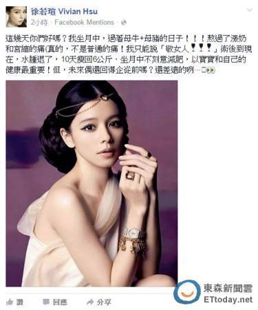 徐若瑄23日在脸书上先是和粉丝们问好,再表示“熬过了涨奶和宫缩的痛(真的,不是普通的痛!)我只能说‘敬女人!’”更说自己最近因为正在坐月子,每天“过着母牛+母猪的日子”,但天生丽质却在10天内瘦6公斤,让网友好羡慕!