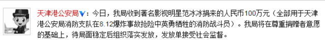 天津港公安局官方微博表示:“今日,我局收到著名影视明星范冰冰捐来的人民币100万元(全部用于天津港公安局消防支队在8.12爆炸事故抢险中英勇牺牲的消防战斗员)。我局将在尊重捐赠者意愿的基础上,待局面稳定后组织落实发放,发放单接受社会监督。”