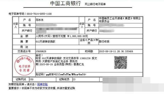 腾讯娱乐讯 天津港爆炸事件后,娱乐圈的明星们也纷纷进行爱心接力,捐款捐物。今天(8月19日下午),天津港公安局官方微博就证实范冰冰捐款100万,还晒出了电子回单。据悉,范冰冰这笔捐款是希望全部用于事故抢险中英勇牺牲的消防战斗员。