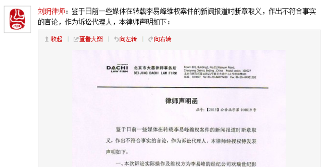 鉴于日前一些媒体在转载李易峰维权案件的新闻报道时断章取义,作出不符合一书实的言沦,作为诉讼代理人,本律师经授权特发表声明如下: