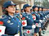 仪仗队女兵正在训练。红十字是白求恩国际医疗方队最鲜明的特点。
