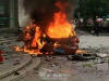 一辆小轿车爆炸起火,火势很快吞噬整个轿车。