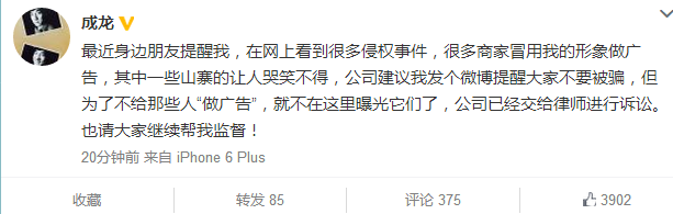 中新网8月25日电 今日,成龙在微博批山寨广告,称很多商家冒用自己的形象做广告,公司已交给律师进行诉讼。