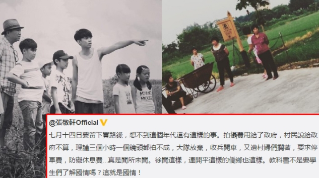 腾讯娱乐讯 据香港媒体报道,张敬轩昨天在社交网站大吐苦水,称在内地广东开平拍摄期间,却遇上当地居民苛索费用,他表示:“七月十四日要留下买路钱,想不到这个年代还有这样的事,拍摄费用给了政府,村民说给了政府不算,理论3个小时一个镜头都拍不到。”但大队正打算离开时,村民不肯罢休,拦路要求索取停车费、妨碍休息费等,张敬轩总结时感叹说:“教科书不是要学生们了解国情吗?这就是国情!”