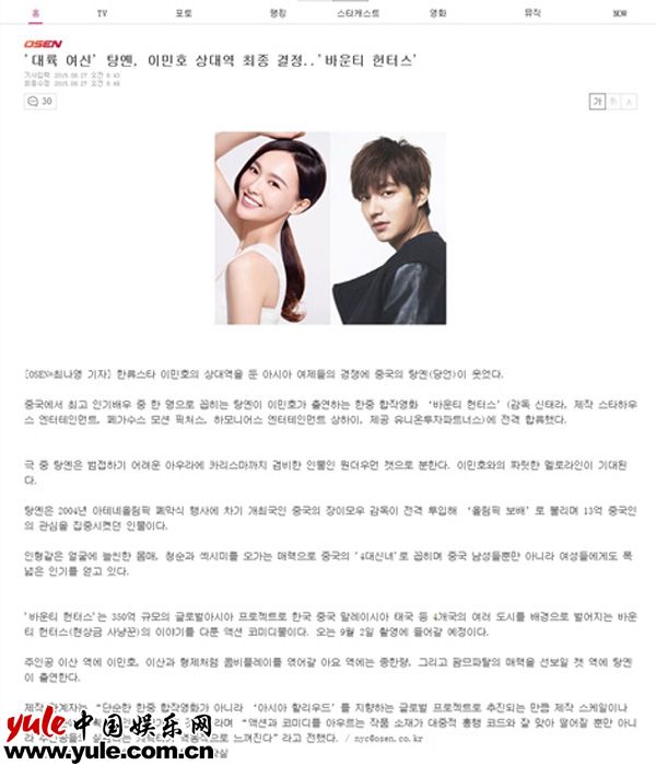 中国艺人网讯www.11job.com 8月27日,据韩国媒体报道,中国女演员唐嫣将出演电影《赏金猎人》,并担任女一号搭档韩国演员李敏镐。