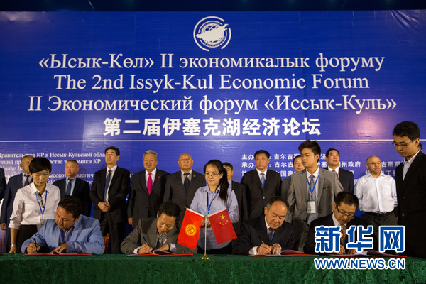 8月26日,第二届伊塞克湖经济论坛上,中国路桥、华和国际商务咨询机构、乌鲁木齐高新区(新市区)、比什凯克自由经济区代表签署了《中吉工业园项目合作备忘录》。新华社发