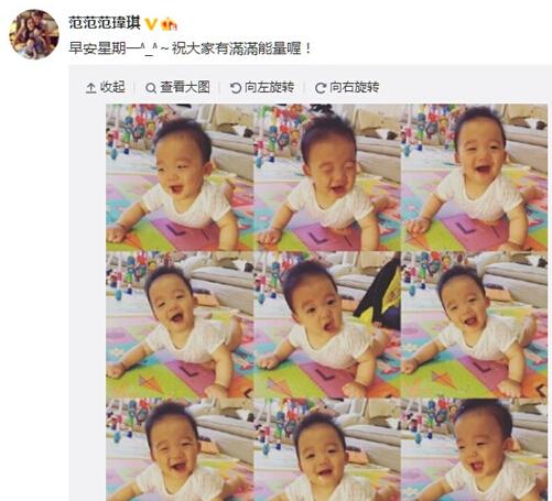 中新网8月31日电 今日清晨,范玮琪在微博晒出爱子萌照拼图,还留言称,“早安星期一,祝大家有满满能量喔”。照片中,孩子穿着半袖短裤,趴在地上,脸上眉开眼笑,呆萌可爱。