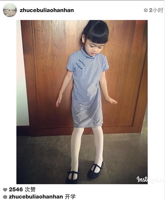 照片中,韩小野一身民国风打扮,身穿浅蓝色的旗袍,配白色长袜和黑色布鞋,乖巧可爱。让人不得不感叹,眨眼间萌娃已经变成可爱的小女生了。