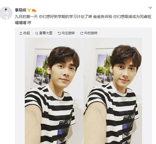 中新网9月1日电 今日,李易峰在微博晒出帅照,还留言称,“九月的第一天,你们想好新学期的学习计划了嘛,偷偷告诉我,你们想跟谁成为同桌呢”。照片中,他身穿横条纹半袖,嘴角微扬,造型阳光清爽。