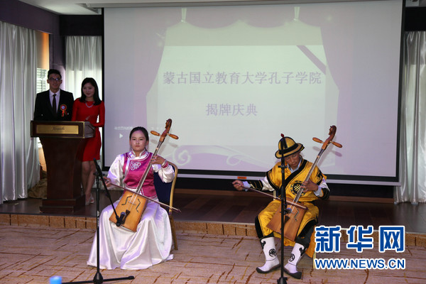 9月1日,在乌兰巴托,蒙古国立教育大学孔子学院揭牌仪式上进行马头琴表演。新华社记者 郑闯摄