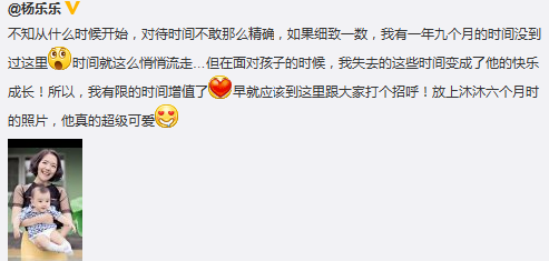杨乐乐发文称:“不知从什么时候开始,对待时间不敢那么精确,如果细致一数,我有一年九个月的时间没到过这里。时间就这么悄悄流走…但在面对孩子的时候,我失去的这些时间变成了他的快乐成长!所以,我有限的时间增值了。早就应该到这里跟大家打个招呼!放上沐沐六个月时的照片,他真的超级可爱。”