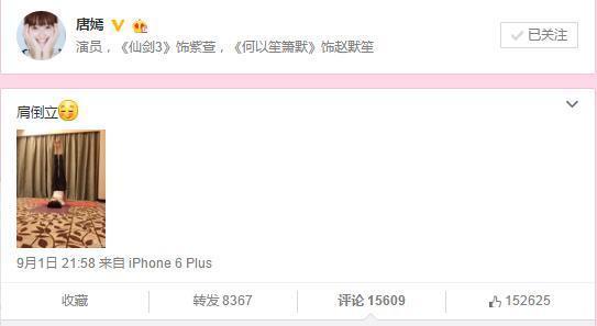 照片曝光后,网友纷纷围观留言,“糖糖好棒”“大长腿真任性”。因为倒立关系,唐嫣还小露额头,不少网友也打趣道,“大大的额头。”