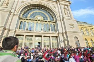 9月2日,在匈牙利首都布达佩斯的东火车站外,难民要求乘坐前往德国的列车,并对警察的阻拦表示抗议。 (新华图片)