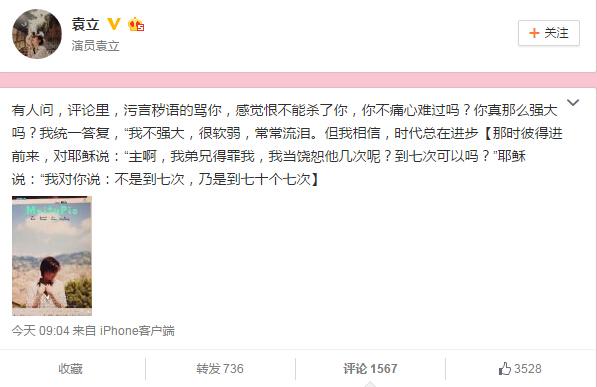 腾讯娱乐讯 9月4日上午,42岁的袁立发微博称:“有人问,评论里,污言秽语的骂你,感觉恨不能杀了你,你不痛心难过吗?你真那么强大吗?我统一答复,“我不强大,很软弱,常常流泪。”