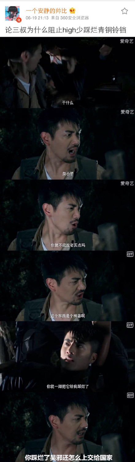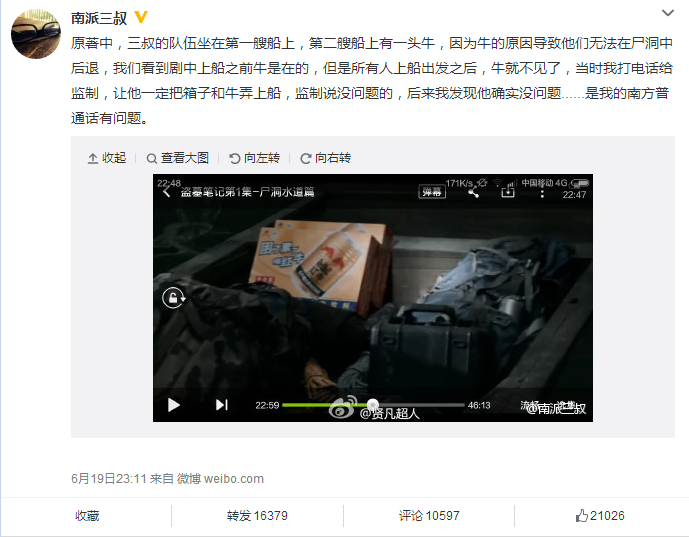 @南派三叔 :原著中,三叔的队伍坐在第一艘船上,第二艘船上有一头牛,因为牛的原因导致他们无法在尸洞中后退,我们看到剧中上船之前牛是在的,但是所有人上船出发之后,牛就不见了,当时我打电话给监制,让他一定把箱子和牛弄上船,监制说没问题的,后来我发现他确实没问题......是我的南方普通话有问题。