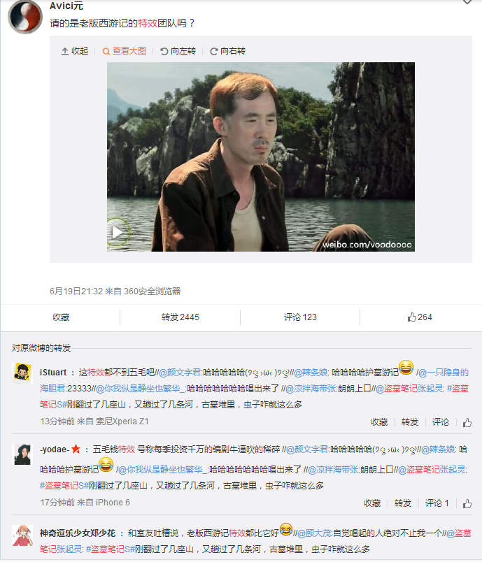 自先导版播完,6月19日《盗墓笔记》迎来第一集,段子手已然刷屏,基本呈现槽点和段子齐飞。制片方之前宣称“投资超过8000万元,而且有好莱坞的特效班底保驾护航”,但“五毛特效”已然把网友逼成了“段子手”。