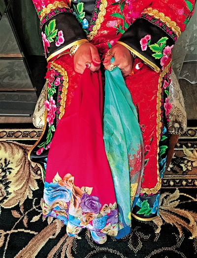 阿谢拉戴满父母和婆家给的首饰,不管走到哪里,双手持一红一绿两条丝绸手帕,手帕绕过食指用拇指压住。