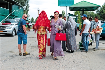 8月8日早上,新娘阿谢拉在哈萨克斯坦的娘家举行过回族婚礼仪式后,她蒙着红盖头,穿着金线绣花大襟长袍,踩着红色绣花鞋,办好过关卡的通行证,穿过一根横杆和一间屋子组成的边境口岸,来到一条马路之隔的吉尔吉斯斯坦“陕西村”的新家。中午她将在新家继续举办一场东干人的婚礼。唐代开辟的丝绸之路“新北道”也是从这里穿过。