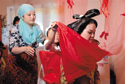 洗脸更衣,手工绣制的龙凤大襟长袍被换成清朝式样的旗袍,新娘仍然梳着有着上百年历史的燕燕头,这种发型在今日中国早已销声匿迹。假发套上只插着一柄雕刻精细的银勺子,列纳特的大伯说,这是阿谢拉娘家传下来的100多年的物件,这银勺不知插上过多少位出嫁姑娘的发髻,用完会还回去。