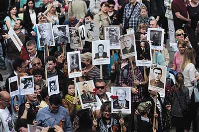 2015年5月9日,德国柏林特雷普托地区,人们手持苏联士兵的照片,参加二战结束70周年纪念活动。