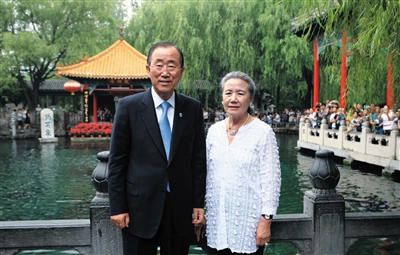 昨日,联合国秘书长潘基文与夫人在济南趵突泉留影。趵突泉官博截图