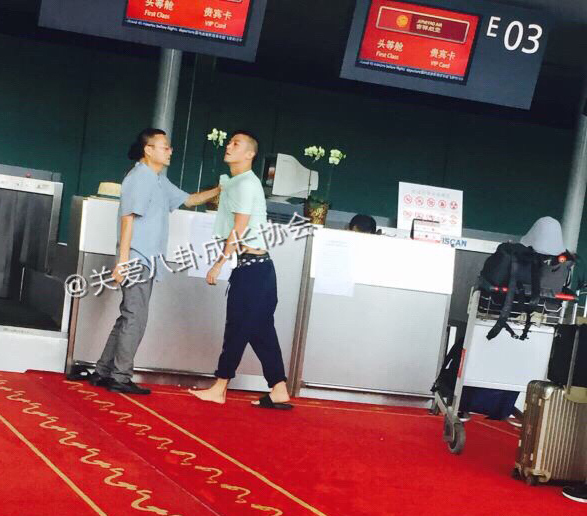 腾讯娱乐讯 今日下午,陈冠希现身上海虹桥机场,在排队时与旅客发生冲突。当时,陈冠希怒把对方身份证扔在地上,场面十分混乱。照片中可以清晰地看到插队大叔气势汹汹地揪住陈冠希的衣领不放。陈冠希的鞋子也少了一只,一只脚光秃秃地站在地上。