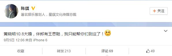 腾讯娱乐讯 9月5日中午,微博认证为“著名娱乐策划人、星琪文化传媒总裁”的陈琪爆料:黄晓明结婚王思聪将当伴郎。陈琪在微博中写到:“黄晓明10.8大婚,伴郎有王思聪,我只能帮你们到这了!”