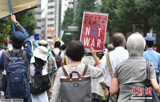 当地时间2015年9月6日,示威者在日本东京高举标语参加反政府集会,抗议充满争议的安全法案。