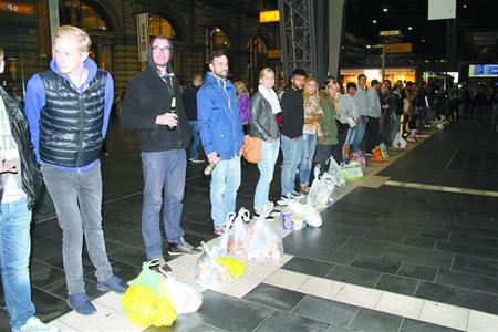 9月5日,热心民众在德国法兰克福火车站排队迎接难民的到来。 新华社发