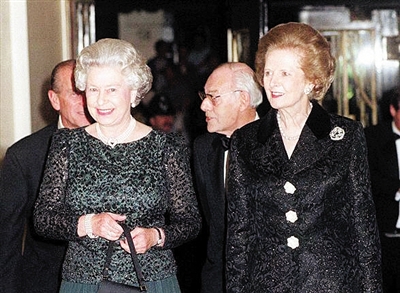 1995年10月,首相玛格丽特·撒切尔夫人与女王在伦敦出席活动。