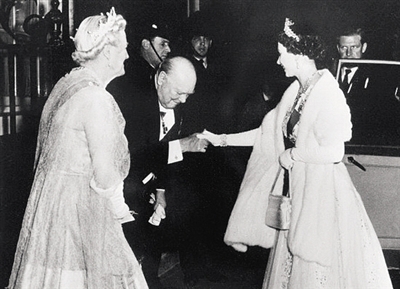 1955年4月,首相温斯顿·丘吉尔在唐宁街10号举行宴会后送别女王。