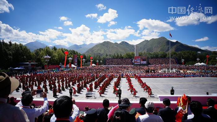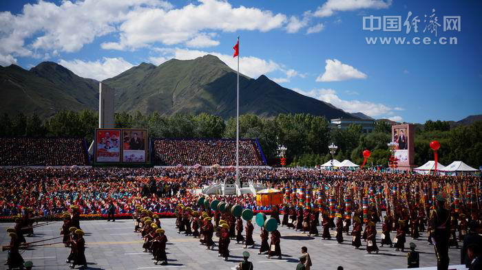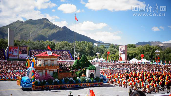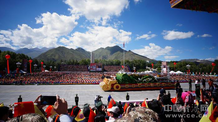 飞舞的彩袖、激情的舞姿、震天的锣鼓、美丽的彩车,9月8日上午,西藏自治区成立50周年庆祝大会将在拉萨市布达拉宫广场举行。展示西藏各地风貌的彩车、各族各界干部群众方队、藏戏歌舞等表演喜庆欢乐,现场有2万余名群众参加这项重大庆典。中国经济网记者 王晋摄