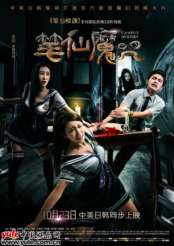 10月23日在中美日韩同步上映,由四国团队联手打造的魔幻恐怖巨制《笔仙魔咒》今日发布两款“夺命”版海报。此前预告片中提到的“未送走”的笔仙终于显现,并制造出一系列恐怖事件。两张海报中,主人公均身穿校服,被不可知的神秘力量所戕害。一图中白妮被幽冥之光攫住身体,飞身离地,大惊失色。另一图中,宋朵朵三人的手都被铅笔钉死在课桌上,鲜血四溅,无法逃离,然而门后的笔仙即刻来临,夺命场面一触即发。两款海报奠定了此次笔仙故事的残酷血腥,幽冥诡异,四国团队将《女高怪谈》、《午夜凶铃》等经典恐怖片元素融合在一起,势必再造中国恐怖电影的一座丰碑。