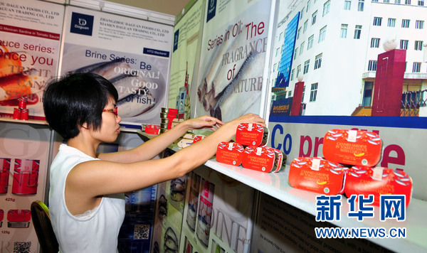 9月7日,在安曼,厦门一展台的工作人员在摆放鱼罐头展品。新华社记者程春香 摄