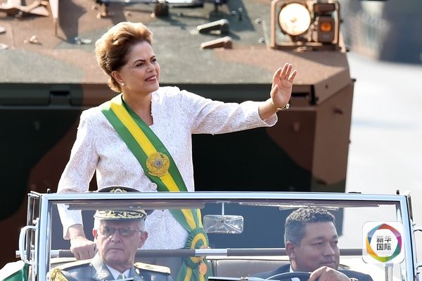 9月7日,巴西总统迪尔玛·罗塞夫在巴西独立日纪念活动中阅兵。(图片来源:新华/法新)