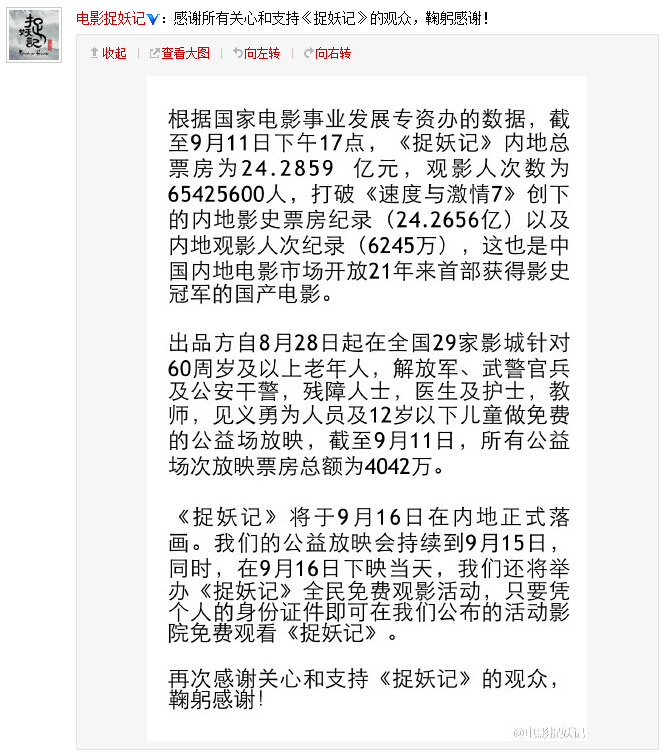 中国娱乐网消息 www.yule.com.cn 《捉妖记》超越《速度与激情7》,登顶内地票房冠军。9月11日,电影《捉妖记》发来捷报,截止9月11日下午17点,《捉妖记》内地总票房为24.2859亿元,超越《速激7》创下的内地影史票房纪录24.2656亿。这也是中国内地电影市场开放21年来,首部获得影史冠军的国产电影。