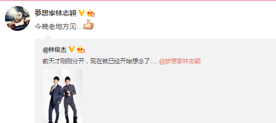 稍晚林志颖也转发该条微博,并告诉林俊杰晚上要在老地方见,让网友边笑边喊:“太令人嫉妒了!”并好奇2人会不会又晒照“秀恩爱”。
