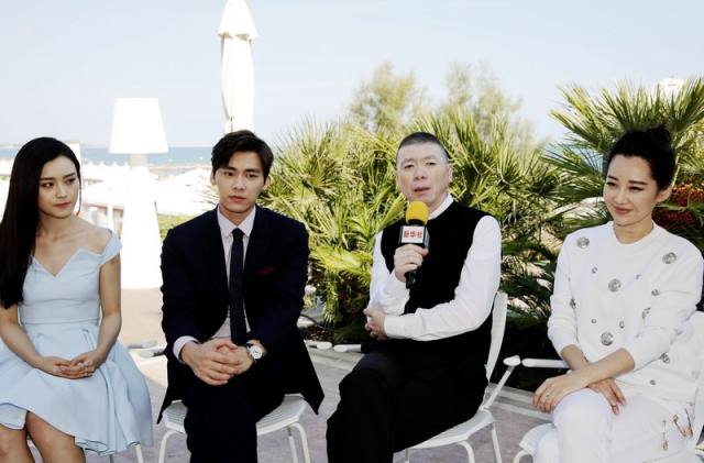 ↑9月11日,在意大利第72届威尼斯电影节,中国电影《老炮儿》主演冯小刚接受新华社记者采访,该片其他主演许晴(右一)、李易峰(左二)和尚语贤(左一)也同时在场。(新华社记者叶平凡摄)