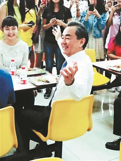 王毅将坐在大厅上方的同学称为“高高在上”的年轻人,希望他们坚定信念、继承传统,力争成为文武双全、内外兼修、学贯中西的外交人才。