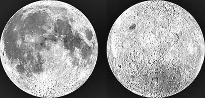 月球近面(左图)比远面(右图)有更多暗色的玄武岩平原