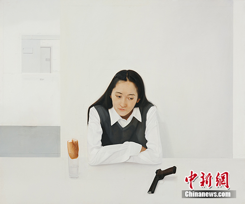 例如,在本次展出的画作《一个叙事者与一个叙述者》中,梁浩画了两个身穿白大褂、手戴白手套的人在为一条死鱼注射。而在另一幅作品《测量一支枪的长度》中,梁浩画了一个女孩和一支手枪以及一个上面塞着面包的水杯。显然,这些画中的场景几乎无法在现实中看到。艺术家通过写实的手法表现出的场景甚至可以看出些许荒诞的意味。