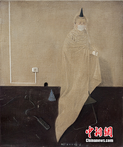 在本次展出的米杰作品中,有多个反复出现在画中的形象:一个站在高处、戴着口罩、围着床单的人,插线板,以及墙上的老鼠洞。