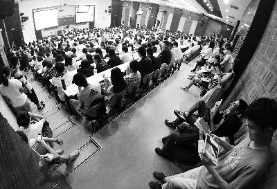 9月14日,是北大新学期上课的第一天。晚上6时许,记者来到第二教学楼的101室,这个能容纳约500人的阶梯教室早已坐满了学生,男女生比例基本持平。一些来晚的人只能到隔壁教室借凳子,连台阶上都挤满了人。